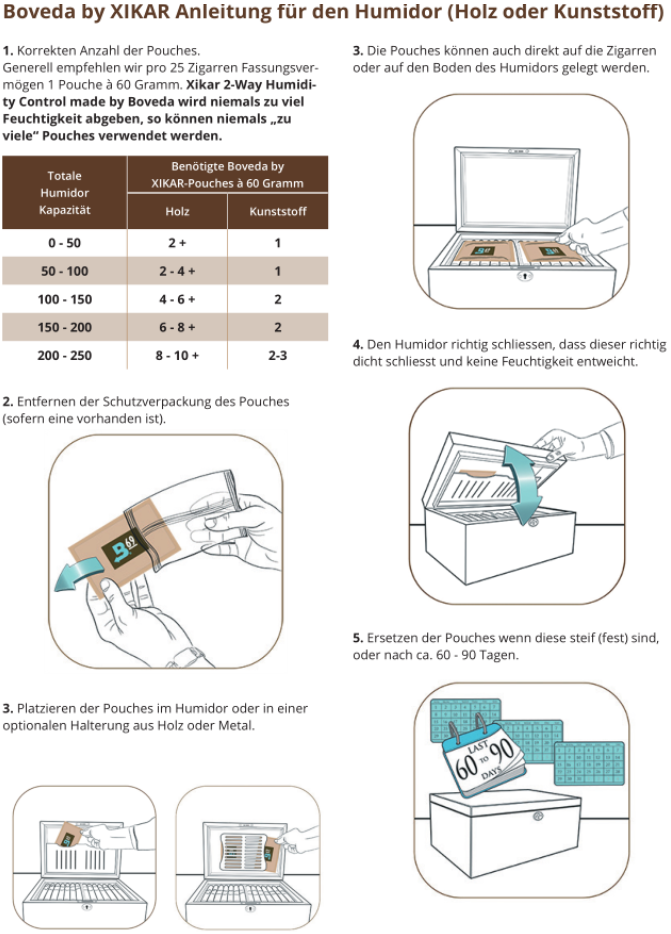 Legen Sie einfach die entsprechende Anzahl Boveda Packs in den Humidor – fertig. Sie müssen nur nach jeweils 2–3 Monaten ausgetauscht werden.